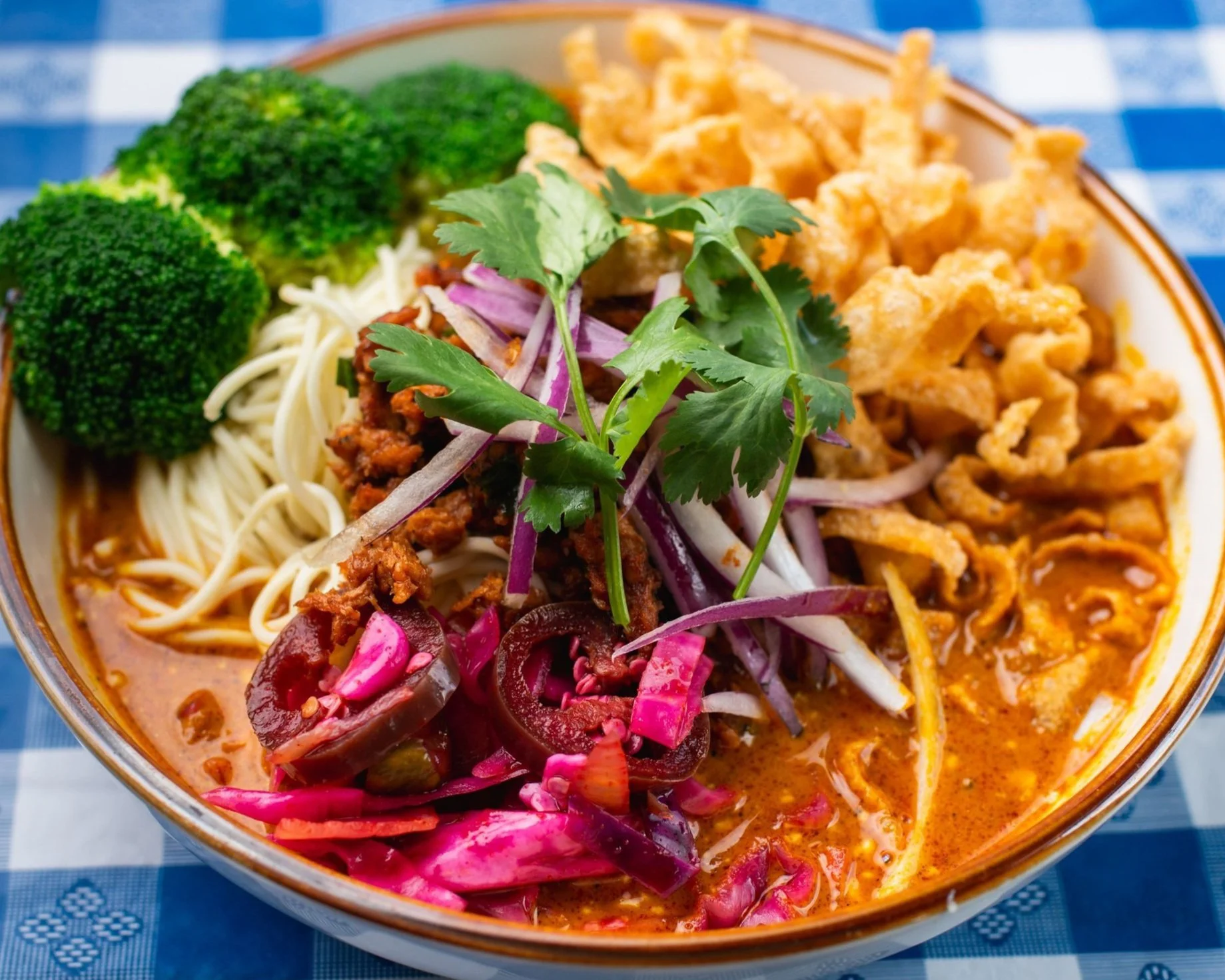 yellow noodle, chiang mai curry, seasoned soy curls, broccoli, crispy wontons, pickled cabbage, red onion, chili oil, cilantro (medium) 🌶️🌶️
