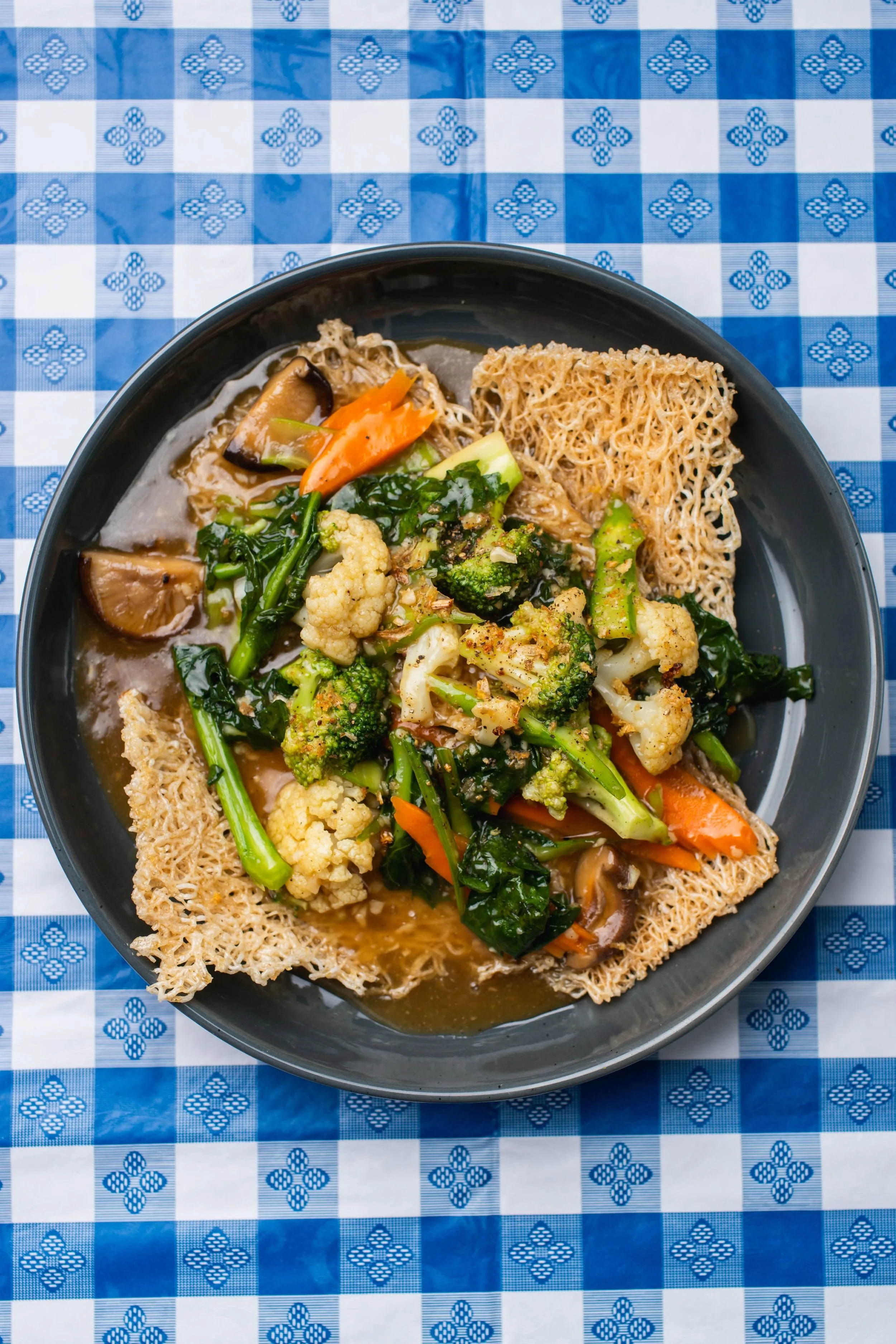banh hoi noodle, Chinese broccoli, broccoli, mushrooms, carrot, cauliflower, shiitake, garlic gravy sauce, sesame oil